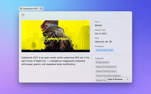 Search and view information about any game on steam, as well as games you own.