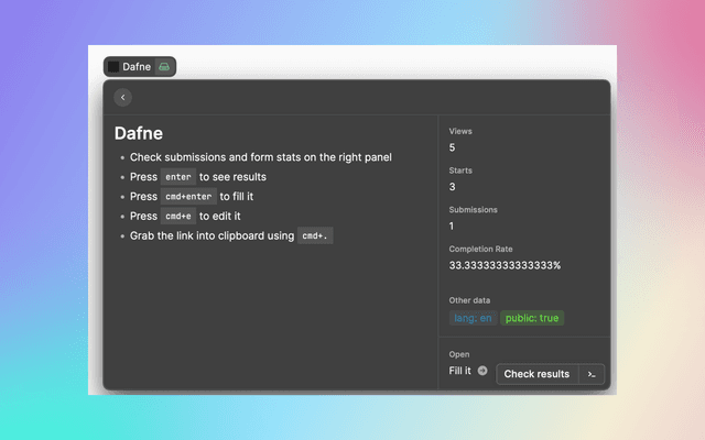Explore your workspaces, list your form and get and overview of forms stats.