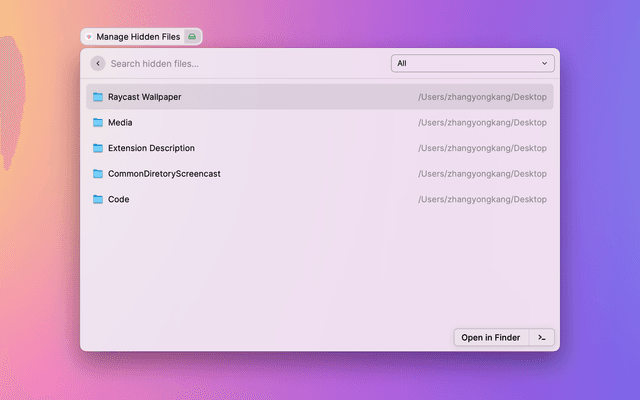 - 🌟🌟🌟But you can always use the shortcut " ⇧+⌘+. " or Raycast build-in Toggle Hidden Files command to see all system hidden files.