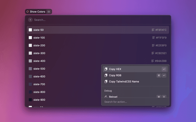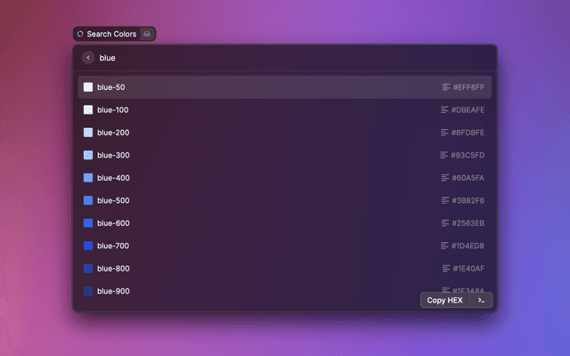 Pick a color to copy the hex value, the rgb value, or the TailwindCSS color name and paste elsewhere.