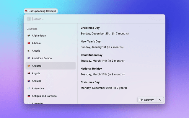 Show the upcoming five holidays for a country